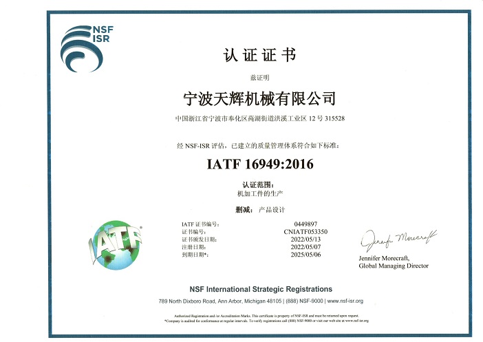天輝通過了IATF16949:2016 質(zhì)量管理體系認證。公司內(nèi)的進料流程、生產(chǎn)流程、生產(chǎn)工藝、出貨流程等精密鑄造加工都是按照IATF16949質(zhì)量標(biāo)準(zhǔn)執(zhí)行,嚴格的控制產(chǎn)品質(zhì)量。在滿足質(zhì)量的前提下,達到快速交貨,讓客戶滿意。